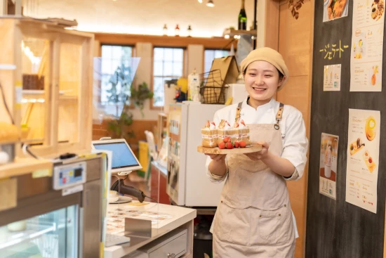 【完全週休2日・残業代全額支給】緑あふれるカフェ併設のパティスリー|ケーキはもちろんパフェ、ジェラートなどオールマイティに経験できるのが魅力です◎