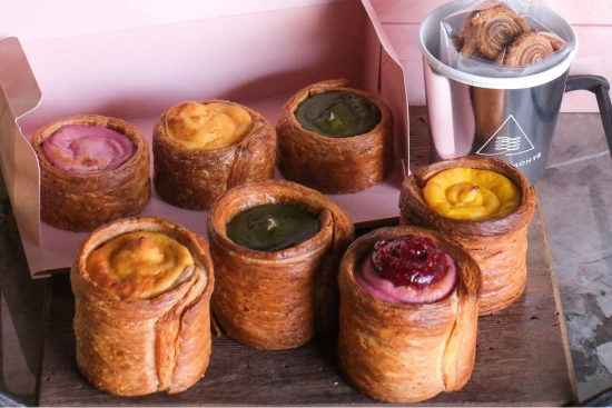 パケモンテでは「コントラスト」を商品コンセプトに、近年のフランスのトップシェフ達の間で目立つ特殊製法のパイ生地について研究を重ね、特殊技法を用いた多層からなる筒状のパイ⽣地にフラン液を流し込んで焼きあげてパリサクとプルトロの2つの食感のコントラストを実現し、他にはないオリジナルのフランをご提供しています。