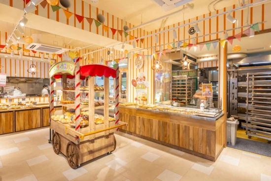 焼きたてのパンが目の前に並び、お客様と直接会話ができるオープンな設計。グッズ展開やファミリー向けの可愛らしい空間など、「また来たくなる」仕掛けが詰まったお店です。