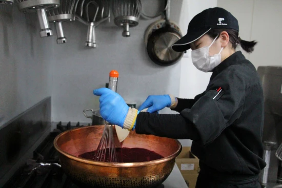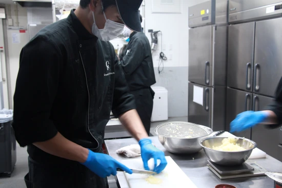 製造スタッフは25歳前後が中心で、若手が主役のチームです。現場は細かな分業で固定するというより、スーシェフ・サードシェフがその日の人数や優先順位を見ながら仕事を割り振り、周りと連携して前に進めるスタイル。新しく入った人は計量やサポートから入り、経験を積むほど仕込みや中核工程へ。さらに特徴的なのは、製造メンバーも販売シフトに入ること。「厨房が見えない環境だからこそ、お客様の表情や声を知って“作業員”にならない」ための仕組みで、接客を通じて仕事の解像度が上がります。礼儀や挨拶を大切にしつつ、“チーム同じ方向を目指す”という空気感があり、成長意欲のある人ほど居場所が広がる職場です。