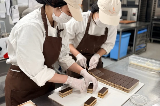 フレデリック・カッセルのものづくりを支える経堂のアトリエ。店頭販売だけでなく、ブランドの商品を安定して届けるための“製造の中心”となる場所です。現場では焼菓子・生菓子を中心に、日々の仕込み、焼成、仕上げまでを分担しながら進めており、製造スタッフは約9名。20代〜30代の女性スタッフが多く、仕事中はそれぞれが持ち場に集中しながら、必要な場面では声を掛け合って進めています。にぎやかに会話が飛び交うというよりは、音楽が流れる中で黙々と作業に向き合う落ち着いた雰囲気。接客に入ることは基本的にないため、製造にしっかり集中したい方には心地よい環境です。朝は少し早いですが、その分、通常期は夕方前後には業務を終える日も多く、メリハリをつけて働ける体制を整えています。