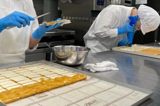 そんなブランドの味を支えているのが、品川にある工房です。ここでは冷蔵タイプのバターサンドを中心に、パティシエたちがほぼすべての工程を手作業で製造しています。ドライフルーツをピンセットで一粒ずつ並べたり、サブレを一枚ずつ型取りしたり。細かな作業を丁寧に積み重ねながら、手仕事ならではのおいしさを形にしている場所です。量産工場というよりも、パティシエが集まる少し広めのアトリエのような空間。ブランドの根っこを支える、ものづくりの中心地です。