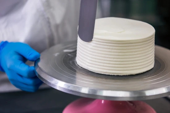 ムースの仕込みやスポンジの焼成、冷凍ケーキの組み立てまでを工場で完結させ、最終的な飾り付けは各店舗が担当。