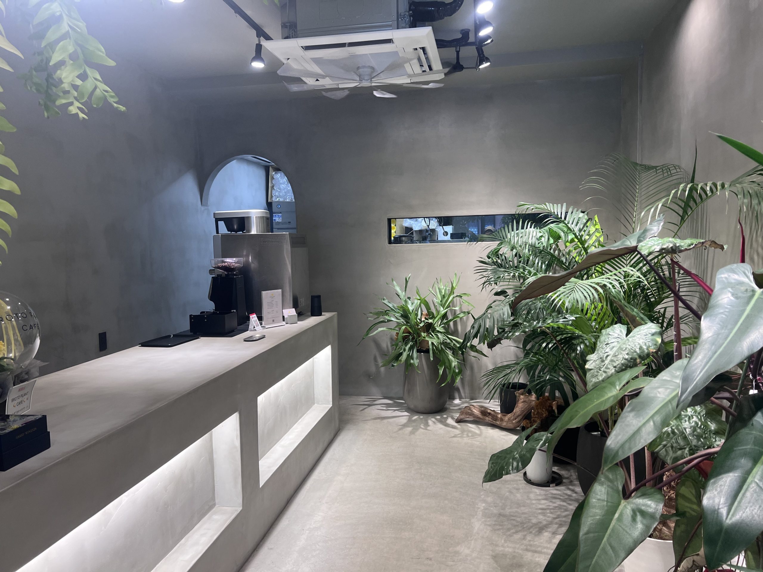 店内は木目の壁やテーブル、グリーンが配置され、ぬくもりを感じるおしゃれな空間が広がっています.