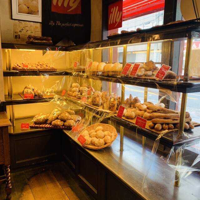 「赤メック」の愛称で親しまれる、京都のパン好きなら誰もが知る名店。黒を基調としたシックな店内は、まるでパリのブーランジェリーそのもの。ハード系のパンからヴィエノワズリまで、どれを選んでも間違いのない美味しさです。