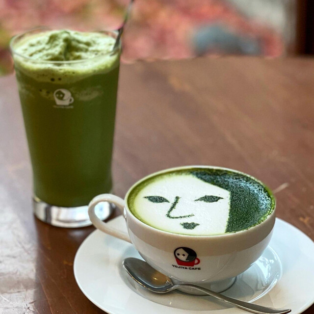 あぶらとり紙で有名な「よーじや」がプロデュースするカフェ。美しい庭園を眺められる落ち着いた空間で、おなじみのロゴマークが描かれた「抹茶カプチーノ」がいただけます。飲むのがもったいなくなる可愛らしさです。