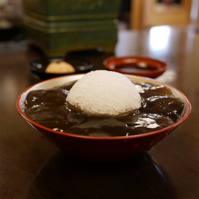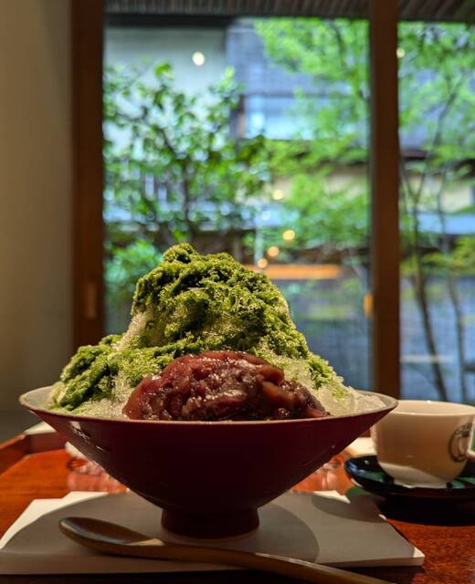 祇園の路地裏にひっそりと佇むカフェ。昼は甘味、夜はバーとして営業しており、洗練された大人の空間が広がります。ここのかき氷は、まるで淡雪のように繊細で、口に入れた瞬間にすっと消えるのが特徴。濃厚な抹茶蜜と上品な甘さの餡が絶妙にマッチします。