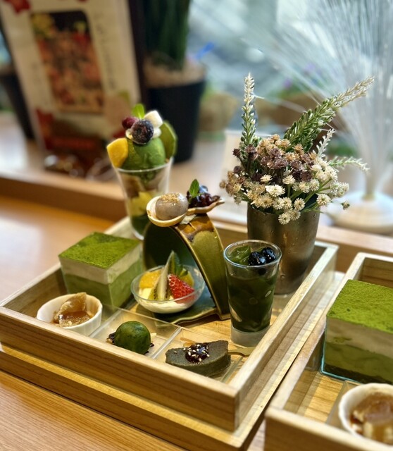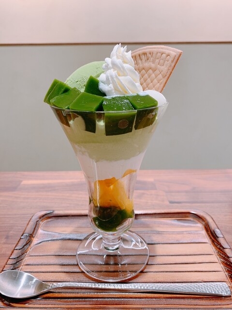 京都駅ビルに入るこのお店は、季節のフルーツを山のように盛り付けた「〇〇やま」シリーズで常に話題沸騰。抹茶パフェでは人気の「京の盆栽」が人気です。大ぶりな抹茶チュイルの下には黒糖ジェノワーズや白玉など、抹茶と相性抜群の素材を組み合わせた、抹茶好きにはたまらない一品です。
