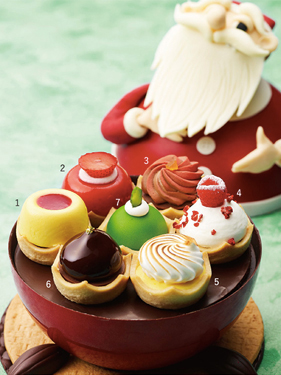 「SANTA CLAUS (サンタ クロース)」は、サンタのお腹をあければ7 種のタルトが入っているユニークなケーキ。こちらはすべて異なるタルトの中から、それぞれ好きなものを選んで食べるという「シェア」がテーマ。流行を反映した現代的なケーキです。